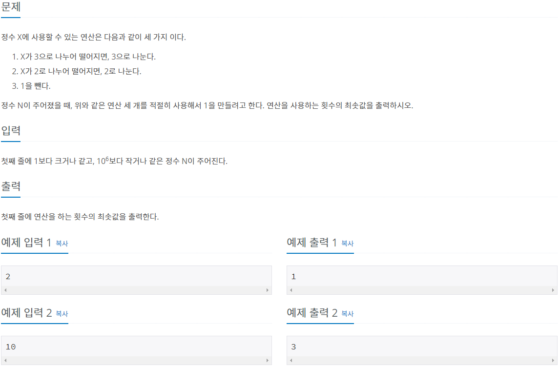 -> 정수 3을 1로 만드는 최소 횟수는 1이다.