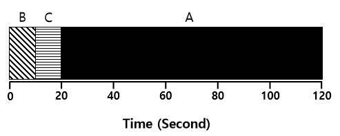 문제가 무엇인지 설명하기 위하여 예를 들어보자. 이번에는 A는 t = 0에 도착하고 100초의 실행 시간을 가지고 있고, 반면에 B와 C는 t = 10에 도착하고 각각 10초의 실행 시간을 가진다고 가정하자. 순수한 SJF로 스케줄 했을 경우 다음 그림과 같다.
