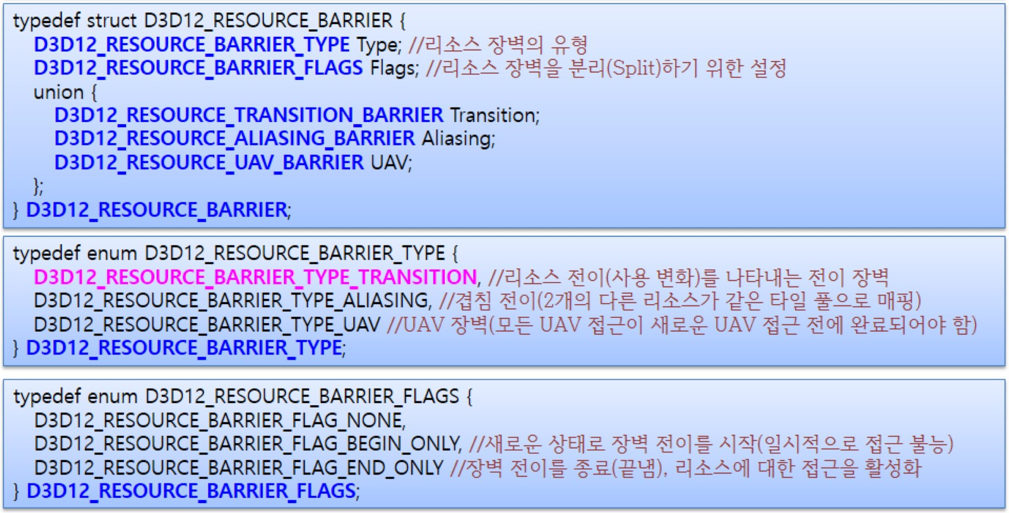 자원 상태 전이는 전이 자원 장벽(Transition resource barrier)들의 배열을 설정해서 지정한다. 배열을 사용하는 덕분에, 한 번의 API 호출로 여러 개의 자원을 전이할 수 있다. 코드에서 자원 장벽은 D3D12_RESOURCE_BARRIER_DESC 구조체로 서술된다.
