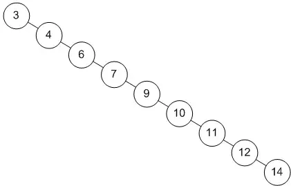 위와 같이 이진 트리가 구성되면 실제 이진 트리의 장점인 노드 검색 시 성능이 O(logN)이 된다는 것을 보장할 수 없다. 만약 위 그림처럼 트리가 구성되어 있다면 14를 찾기 위해서는 트리의 맨 밑까지 내려가야 한다. 즉, 9번의 노드 검사가 필요하게 된다. 이처럼 위 트리 구조는 최악의 경우에 성능이 O(N)이다.