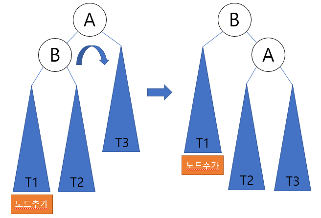 보다 일반적인 경우를 생각해 보자. 일반적인 LL 타입은 조상 노드의 A의 왼쪽 서브 트리의 왼쪽 서브 트리에 노드가 추가됨으로 해서 발생한다. 다음 그림처럼 LL 회전은 노드들을 오른쪽으로 회전시키면 된다.
