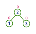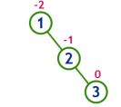 다음 트리가 있을때 노드 0은 리프 노드로 균형도는 0이다. 노드 2는 왼쪽에 자식 노드가 없고 오른쪽에 높이 1의 자식 노드가 있으므로 균형도는 -1이다. 부모 노드는 왼쪽에 자식 노드가 없고 오른쪽에 높이 2의 자식 노드가 있으므로 0 - 2 = -2 의 균형도를 가진다. 따라서 AVL 트리 구조가 되려면 균형도를 맞춰야 하는 대상이 된다.