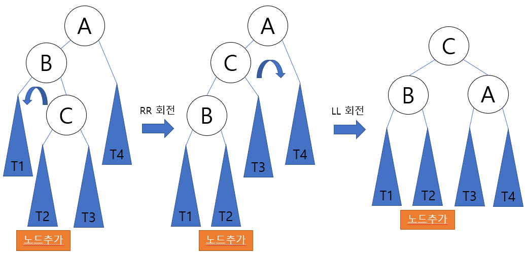 LR 타입은 그림과 같이 A의 왼쪽 자식의 오른쪽 서브 트리에 노드가 추가됨으로 해서 발생한다. LR 회전은 균형 트리를 만들기 위하여 2번의 회전이 필요하다. LR 회전은 RR 회전을 한 다음, LL회전을 하면 된다.