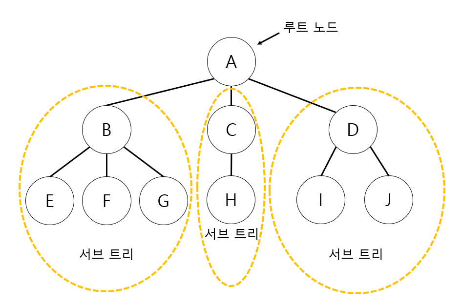 그림에서 루트 노드는 A이며, 다른 노드들 {B, E, F, G}, {C, H}, {D, I, J} 3개의 집합으로 나누어진 노드들은 A의 서브 트리이다. 서브 트리인 {B, E, F, G}의 루트 노드는 다시 B가 되고 나머지 노드 3개는 서브트리가 된다.