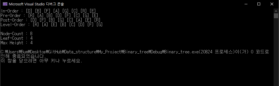 아래 그림과 같은 구조의 트리를 만들어 보도록 하겠다. 그리고 이 이진트리의 전위, 중위, 후위 순회로 알파벳을 출력하며, 노드의 총 개수, 단말노드 개수, 그리고 최고 높이를 출력한다.