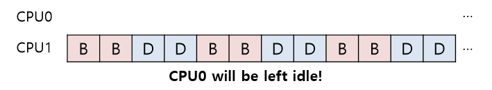 좀 더 까다로운 경우는 그 이전 예에서 발생한다. A는 혼자 CPU 0에 있었고 B와 D는 CPU 1에서 번갈아 실행되고 있었다.