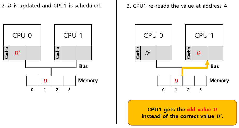 위 그림을 잘 살펴보자. CPU 0에서 실행 중인 프로그램이 주소 1를(D값을) 읽는다. 데이터가 CPU 0 캐시에 존재하지 않기 때문에 시스템은 메인 메모리로부터 데이터를 가져오고 값 D를 얻는다. 그런 후 프로그램은 주소 1의 값을 변경한다. 변경은 캐시에 존재하는 값만 D'로 갱신한다. 메모리에 데이터를 쓰는 것은 시간이 오래 걸리므로 메인 메모리에 기록하는 것은 보통 나중에 한다. 운영체제가 프로그램의 실행을 중단하고 CPU 1로 이동하기로 결정한다고 가정하자. 프로그램은 주소 1의 값을 다시 읽는다. CPU 1의 캐시에는 그러한 데이터가 존재하지 않기 때문에 시스템은 메인 메모리에서 데이터를 가져온다. 이때 D'가 아니라 D를 가져온다.