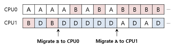 처음에 A는 CPU 0에 혼자 있고 B와 D는 CPU 1에서 번갈아 실행되고 있다. 몇 번의 타임슬라이스 후 B는 CPU 0으로 이주하여 A와 경쟁한다. 그 동안 D는 CPU 1에서 몇 개의 타임슬라이스 동안 혼자 실행된다. 따라서 워크로드 균형이 맞게 된다.