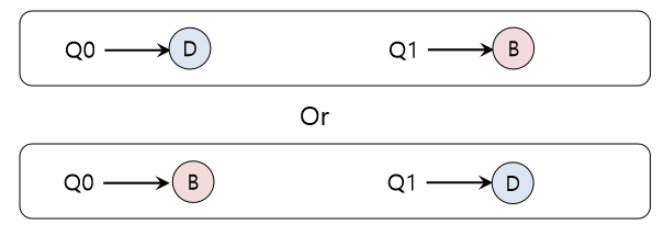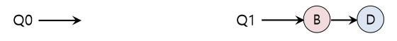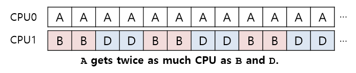 그림에서 알 수 있듯이, A가 B와 D보다 2배의 CPU를 차지하고 이는 원하는 결과가 아니다. 설상가상으로 A와 C가 모두 종료하여 B와 D만 남게 되었다고 가정하자. 스케줄링 큐는 다음과 같을 것이다.
