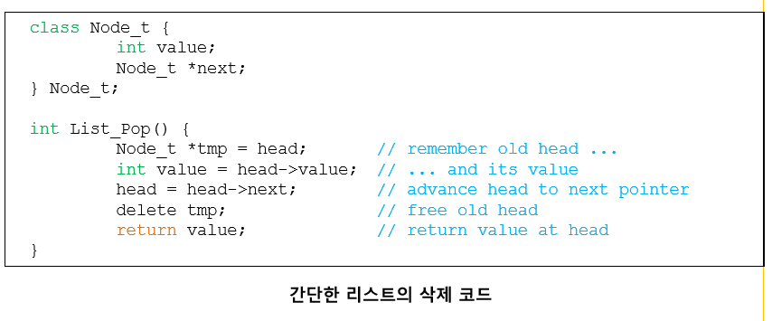 연결 리스트에서 원소 하나를 삭제하는 코드를 생각해보자. 코드는 위 그림과 같다. 두 CPU의 스레드가 동시에 이 루틴으로 진입한다고 가정하자. 스레드 1이 첫 번째 행을 실행하면 head의 현재 값을 tmp에 저장한다. 그런 후 스레드 2가 첫 번째 행을 실행하면 역시 head의 같은 값을 tmp에 저장한다. tmp는 스택에 할당된다. 각 스레드는 자신만의 스택을 갖고 있다. 각 스레드는 동일한 헤드 원소를 제거하려고 한다. 제대로 된 상황에서는 각 스레드는 리스트의 첫 번째 원소를 한 번씩 제거해야 한다. 이러한 상황이 모든 문제를 야기한다. (4행의 헤드 원소를 두 번 삭제하고 같은 데이터의 값을 두 번 반환하는 등)