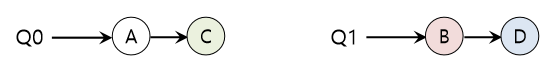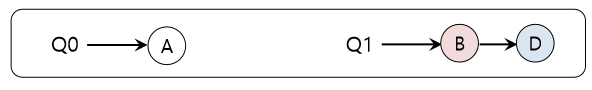 하지만 문제점도 존재하는데, 멀티 큐 기반 방식의 근본적인 문제는 워크로드 불균형(Workload imbalance)이다. 앞의 예와 동일한 설정을 가정하자. 그러나 그 중 하나(C)가 종료 되었다고 하자. 이제 다음과 같은 스케줄링 큐를 가진다.
