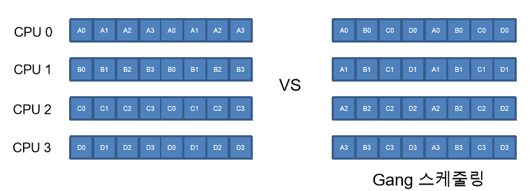 Gang 스케줄링의 장점은 빠른 동기화가 된다는 것이지만, 단점은 캐시 친화성이 약하다는 것이다.