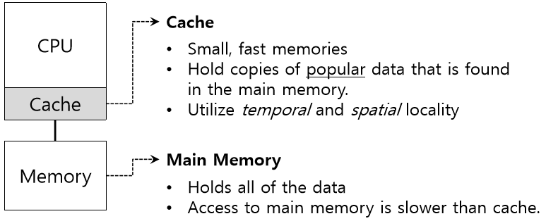 메인 메모리에서 데이터를 CPU로 가져올때 캐시는 다시 사용될 것이라 생각하는 데이터를 캐시에 저장해 놓고 나중에 또 데이터를 가지고 올때 캐시에 그 데이터가 존재하는지 검사한다. 캐시에 존재하기 때문에 데이터는 훨씬 빨리 접근되고 프로그램은 빨리 실행된다.