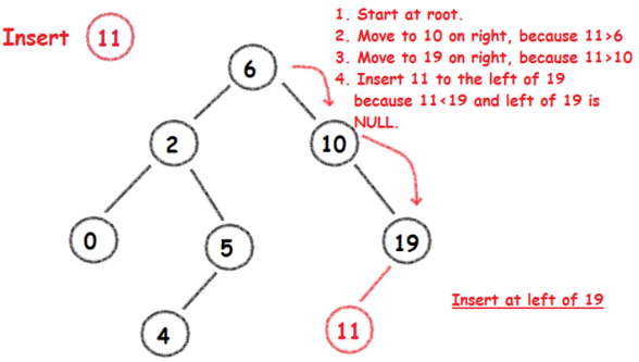 위 그림은 노드 11을 이진탐색트리에 삽입하는 과정을 보여준다. 먼저 루트에서부터 11을 탐색한다. 만약 탐색이 성공한다면 이미 11이 트리 안에 존재하는 것이고, 키가 중복되므로 삽입이 불가능하다. 만약 11이 트리 안에 없으면 어디선가 탐색이 실패로 끝날 것이다. 실패한 위치가 11이 있어야 할 곳이다. 따라서 탐색이 실패로 끝난 위치인 19의 왼쪽에 삽입하면 된다.