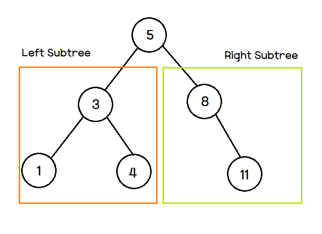 위 그림의 트리는 모든 노드가 이진탐색트리의 조건을 만족한다. 이 트리를 중위 순회 방법으로 순회하면 1, 3, 4, 5, 8, 11과 같이 숫자의 오름차순으로 노드를 방문한다.