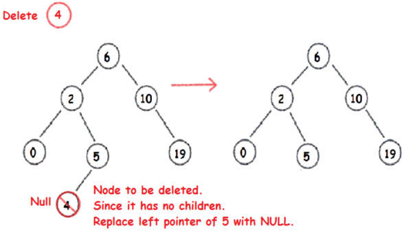 가장 간단한 상황이다. 자식 노드가 없기 때문에 그 노드만 지우면 되기 때문이다. 그러나 트리에서 단말 노드를 없애는 것도 그렇게 간단하지는 않다.