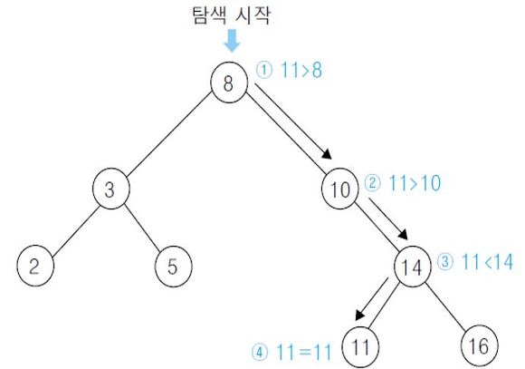루트 아래의 노드에서도 같은 과정을 되풀이한다. 다음 그림은 이진탐색트리에서 11을 찾는 과정을 보여준다.