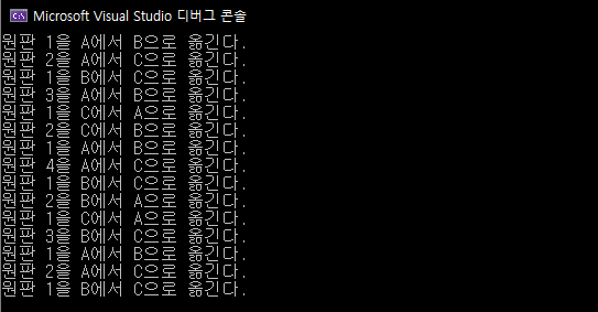 4개의 원판을 A, B, C 막대에서 옮기는 작업의 출력 값은 다음과 같다.