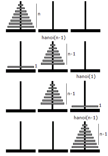 먼저 위에 쌓여 있는 n - 1개의 원판을 B로 옮긴 다음, 제일 밑에 있는 원판을 C로 옮긴다. 그러고 나서 B에 있던 n - 1개의 원판을 C로 옮긴다. 이제 n - 1개의 원판을 옮길 수만 있으면 문제는 해결된다.