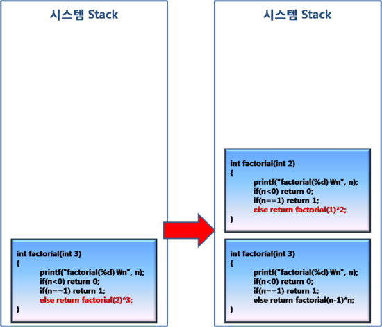 return (n * Factorial(n - 1)); // n > 1인 경우 (순환 조건)