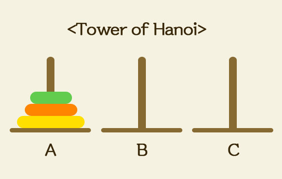 문제는 막대 A에 쌓여있는 원판 3개를 막대 C로 옮기는 것이다. 단, 다음 조건을 지켜야 한다.