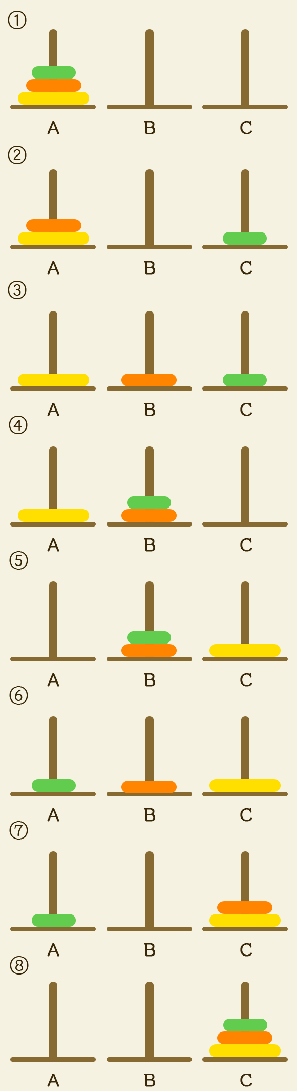 4개의 원판이 있는 경우에는 더 복잡해진다. 일반적으로 n개의 원판이 있는 경우를 해결하려면 상당히 복잡해질 것이다.