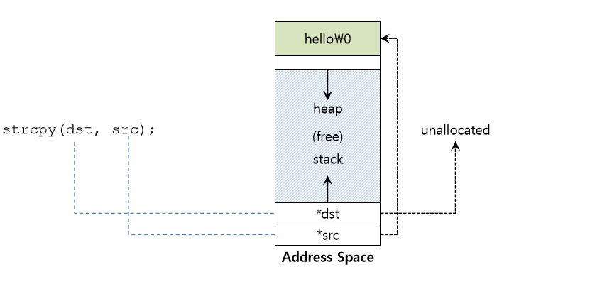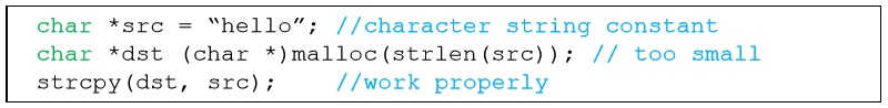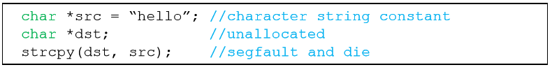 많은 루틴을 자신이 호출되기 전에 필요한 메모리가 미리 할당되었다고 가정한다. 예를 들어 strcpy(dst, src) 루틴은 소스 포인터에서 목적 포인터로 문자열을 복사한다. 그러나 주의 하지 않으면, 다음과 같이 코드를 작성할 수 있다.