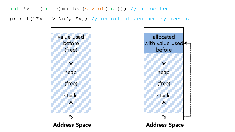 메모리 할당은 우리가 고민하고 있는 문제들 중 쉬운 쪽이다. 할당된 메모리를 언제 어떻게 해제하고 더욱이 해제 여부를 확인하는 것이 더 어려운 문제이다. 더 이상 사용되지 않는 힙 메모리를 해제하기 위해 프로그래머는 free()를 호출한다. 다음 그림들은 정수형 메모리를 힙 메모리에 할당하고 해제하는 과정에서의 메모리가 어떻게 변화하는지를 보여준다.