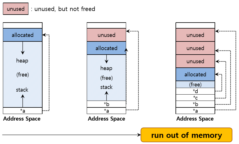 다른 일반적인 오류는 메모리 누수(Memory leak) 이다. 메모리 해제를 잊었을 때 발생한다. 장시간 실행되는 응용 프로그램이나 또는 운영체제 자체와 같은 시스템 프로그램에서는 아주 큰 문제이다. 메모리가 천천히 누수되면 결국 메모리가 부족하게 되고 시스템을 재시작 할 수 밖에 없다. 메모리의 사용이 끝나면 반드시 해제해야 한다.