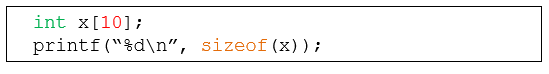 첫 번째 행에서, 정수형 원소 10개를 가지는 배열을 위한 공간을 선언하였다. 그러나 다음 줄에서 sizeof()를 사용하면 4(32bit) 또는 8(64bit) 값을 반환한다. 이 경우 sizeof()는 동적으로 할당받은 메모리의 크기가 얼마인지가 아니라, 정수를 가리키는 포인터의 크기가 얼마인지 물어본다고 생각하기 때문이다. 그러나 때때로 sizeof()는 기대한 대로 동작할 때도 있다.