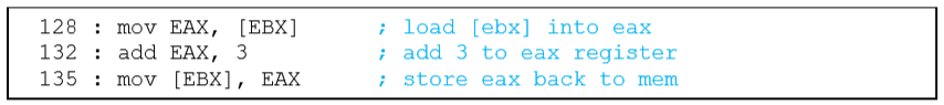 이 코드는 비교적 이해하기 쉽다. x의 주소는 레지스터 ebx에 저장되어 있다고 가정하고 이 주소에 저장되어 있는 값을 mov 명령어를 사용하여 범용 레지스터 eax에 넣는다. 다음 명령은 3을 더하고, 마지막 명령은 eax의 같을 같은 위치의 메모리에 저장한다.