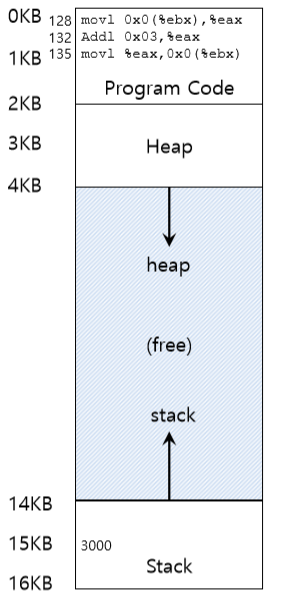 위 그림에서 코드와 데이터가 프로세스 주소 공간에 어떻게 배치되어 있는지 볼 수 있다. 세 개 명령어 코드는 주소 128에 위치하고, 변수 x의 값은 주소 15KB에 위치한다. 그림에서 x의 초기 값은 3000이다.