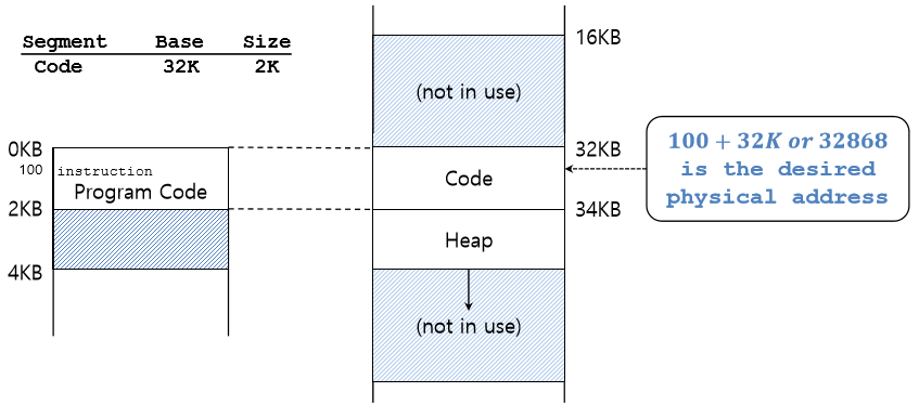 위 그림의 주소 공간을 사용하여 주소 변환을 해 보자. 가상 주소 100 번지를 참조한다고 가정하자. 가상 주소 100번지는 코드 세그멘트에 속한다. 참조가 일어나면 하드웨어는 베이스 값에 이 세그멘트의 오프셋(이 경우는 100)을 더해 물리 주소는 100+32KB 또는 32868이 된다. 그 후, 주소가 범위 내에 있는지 검사하고, 범위 내에 있을 경우, 물리 메모리 주소 32868을 읽는다.