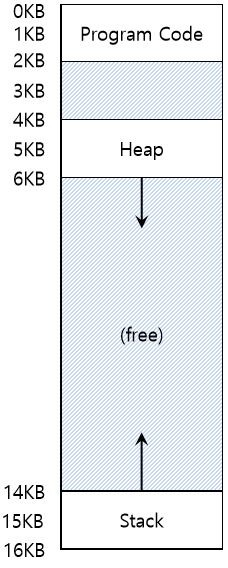 앞에서 살펴봤던 형태의 주소 공간에 대해 재미있는 사실을 발견했을 것이다. 스택과 힙 사이에 사용되지 않는 큰 공간이 존재한다.
