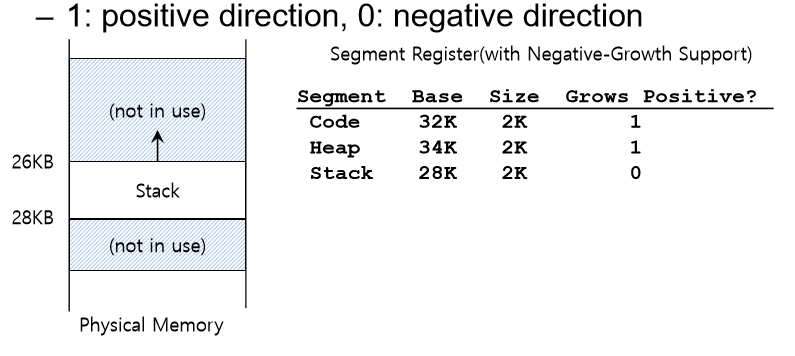첫 번째, 간단한 하드웨어가 추가로 필요하다. 베이스와 바운드 값뿐 아니라 하드웨어는 세그멘트가 어느 방향으로 확장하는지도 알아야 한다. 예를 들어, 하나의 비트를 사용하여 주소가 커지는 쪽(양의 방향)으로 확장하면 1, 작아지는 쪽(음의 방향)으로 확장하면 0으로 설정할 수 있다.