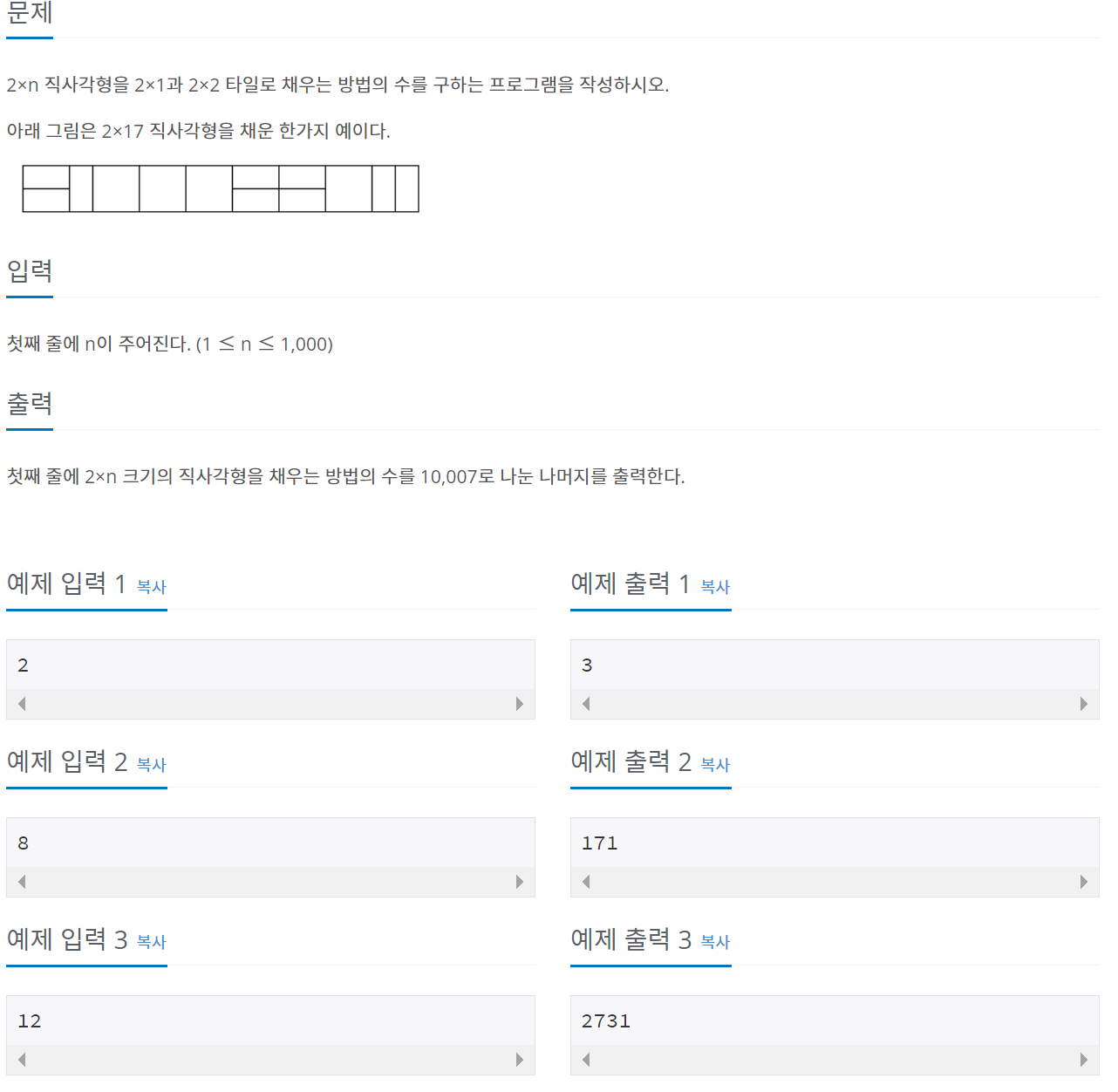 DP[1]은 2x1 타일로 한가지 방법으로만 배치 가능하므로 1이고 DP[2]는 1x2 타일로 한가지, 2x1 타일로 한가지, 그리고 2x2 타일로 한가지 방법으로 배치 가능하므로 총 3이다.