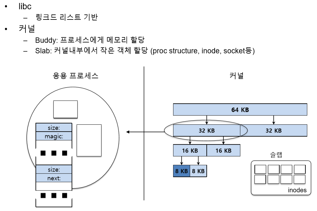 주의할 점이 있다. 만약 4바이트의 메모리 할당을 한다고 하였을때 빈 영역의 크기는 4바이트가 아니라 4바이트 + 헤더의 크기 이다. 그러므로 사용자가 4바이트 메모리를 할당하면 라이브러리는 빈 청크를 찾을때 4바이트 + 헤더의 크기를 탐색한다.