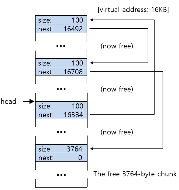 이제 빈 공간 리스트의 첫 번째 원소는 작은 빈 청크이고 두 번째 원소는 큰 빈 청크이다. 드디어 리스트가 하나 이상의 원소를 가지게 되었다. 흔히 일어나는 단편화가 발생하였다.