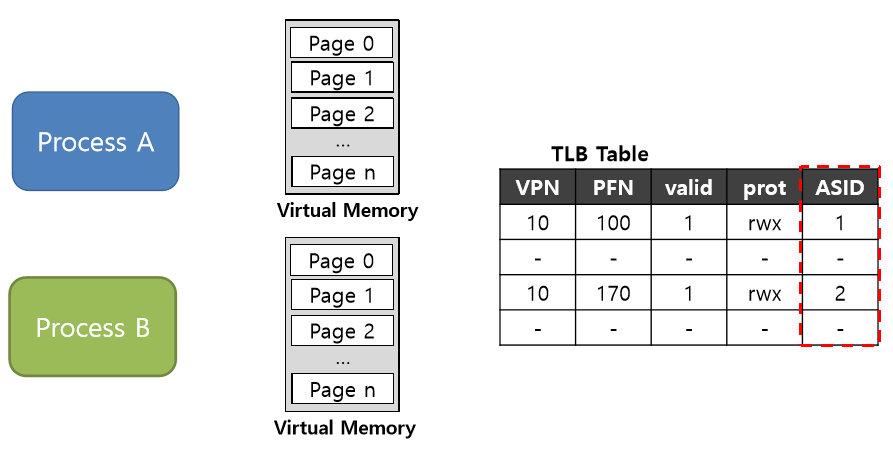 이 부담을 개선하기 위해 몇몇 시스템에서는 문맥 교환이 발생하더라도 TLB의 내용을 보존할 수 있는 하드웨어 기능을 추가하였다. TLB 내에 주소 공간 식별자(Address space identifier, ASID) 필드를 추가하는 것이 그것이다. ASID는 프로세스 식별자(Process identifier, PID)와 대략적으로 유사하다. 단, ASID는 좀 더 적은 비트를 갖고 있다. 위에서 사용한 TLB 예제에 ASID 정보를 추가하면 프로세스들이 TLB의 공간을 공유할 수가 있다.