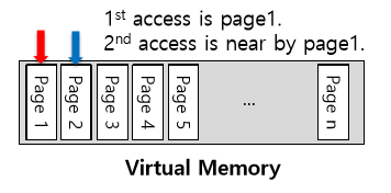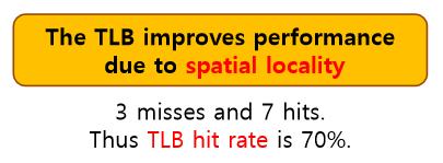 배열 원소를 읽은 TLB 동작을 정리해 보면 미스, 히트, 히트, 미스, 히트, 히트, 히트, 미스, 히트, 히트가 된다. 히트 회수를 총 접근 횟수로 나누어 얻는 TLB 히트 비율은 70%가 된다. 배열이 처음으로 접근되었지만, TLB는 공간 지역성(Spatial locality)으로 인해서 성능을 개선할 수가 있다.