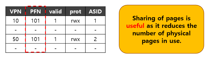 추가적으로 TLB의 두 항목이 매우 유사한 경우를 생각해 볼 수도 있다. 이 예제에서는 두 개의 다른 VPN을 갖는 두 개의 다른 프로세스들의 두 항목이 동일한 물리 페이지를 가리키고 있다.