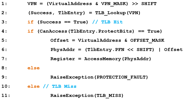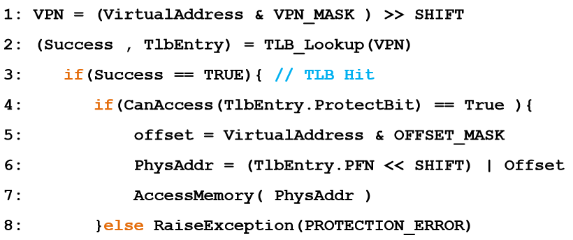 하드웨어 부분 알고리즘은 다음과 같이 동작한다. 먼저, 가상 주소(1번 라인)에서 가상 페이지 번호(VPN)를 추출한 후, 해당 VPN의 TLB 존재 여부를 검사한다.(2번 라인) 만약 존재하면 TLB 히트이고 TLB가 변환값을 갖고 있다는 것을 뜻한다. 이제 해당 TLB 항목에서 페이지 프레임 번호(PFN)를 추출할 수 있다. 해당 페이지에 대한 접근 권한 검사가 성공하면(4번 라인), 그 정보를 원래 가상 주소의 오프셋과 합쳐서 원하는 물리 주소(PA)를 구성하고, 메모리에 접근할 수 있다.(5~7번 라인)