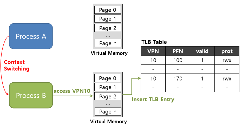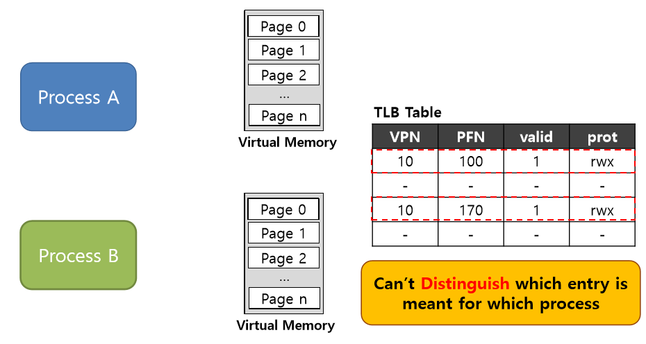 TLB를 사용하게 되면 프로세스 간 문맥 교환 시, 새로운 문제가 등장한다. TLB에 있는 가상 주소와 실제 주소 간의 변환 정보는 그것을 탑재시킨 프로세스에서만 유효하다. 다른 프로세스들에게는 의미가 없다. 새로운 프로세스에서는 이전에 실행하던 프로세스의 변환 정보를 사용하지 않도록 주의해야 한다.