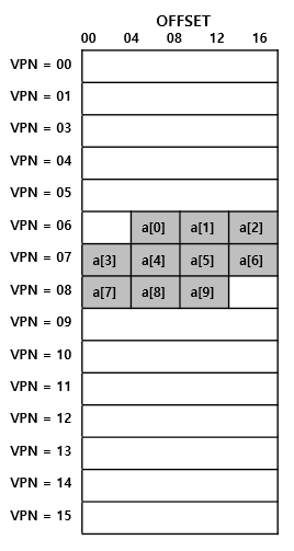 위 그림은 16개의 페이지로 구성된 가상 주소 공간을 도식적으로 표현하고 있다. 배열의 첫 항목(a [0])은 (VPN=06, 오프셋=04)에서 시작한다. 세 개의 4바이트 정수가 페이지에 들어갈 수 있다. 배열은 다음 페이지(VPN=07)에서 계속된다. a[3] ... a[6]의 네 항목이 존재한다. 배열의 마지막 세 개의 항목(a[7] ... a[9])은 주소 공간(VPN=08)에 시작하는 다음 페이지에 들어 있다.