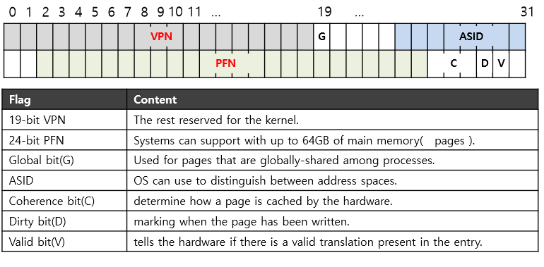 마지막으로 실제 TLB가 어떻게 생겼는지 간략히 살펴보자. MIPS R4000을 예로 들겠다. MIPS R4000은 소프트웨어로 관리되는 TLB를 사용한다. 비교적 최근 시스템이다. MIPS의 간략화된 TLB 항목은 다음과 같다.