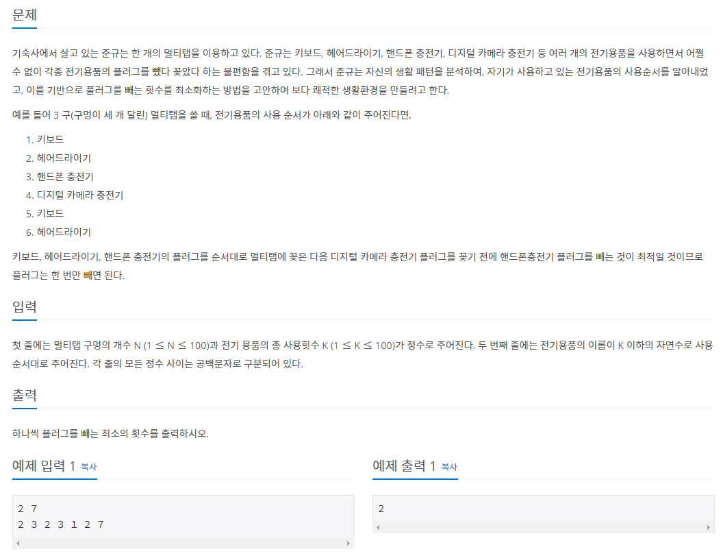 멀티탭에 모든 플러그가 꽂혀있는 경우 N개의 사용순서에서 i번째에 있는 다른 전기용품을 사용해야 한다고 가정하자. 꽂혀있는 전기용품들을 순회돌며 i + 1에서 N까지 추후 또 사용할 전기용품이 존재할때까지 카운트를 샌다. 그 중 카운트가 가장 큰 값의 전기용품 플러그를 빼면 빼는 총 횟수를 최소화 할 수 있다.