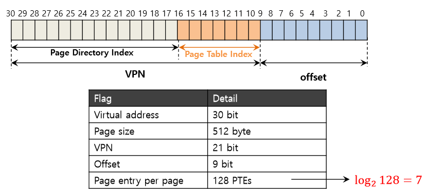 멀티 레벨 테이블에서 몇 단계를 둘지 정하기 위해서는 먼저 한 페이지에 몇 개의 페이지 테이블 항목을 저장할 수 있을지를 계산해야 한다. 페이지 크기가 512바이트이고 PTE의 크기가 4바이트라고 가정하면 한 페이지에 128개의 PTE를 넣을 수 있다. 페이지 테이블의 페이지를 인덱스로 쓰려면, VPN의 하위 7비트(log2(128))가 필요하다.